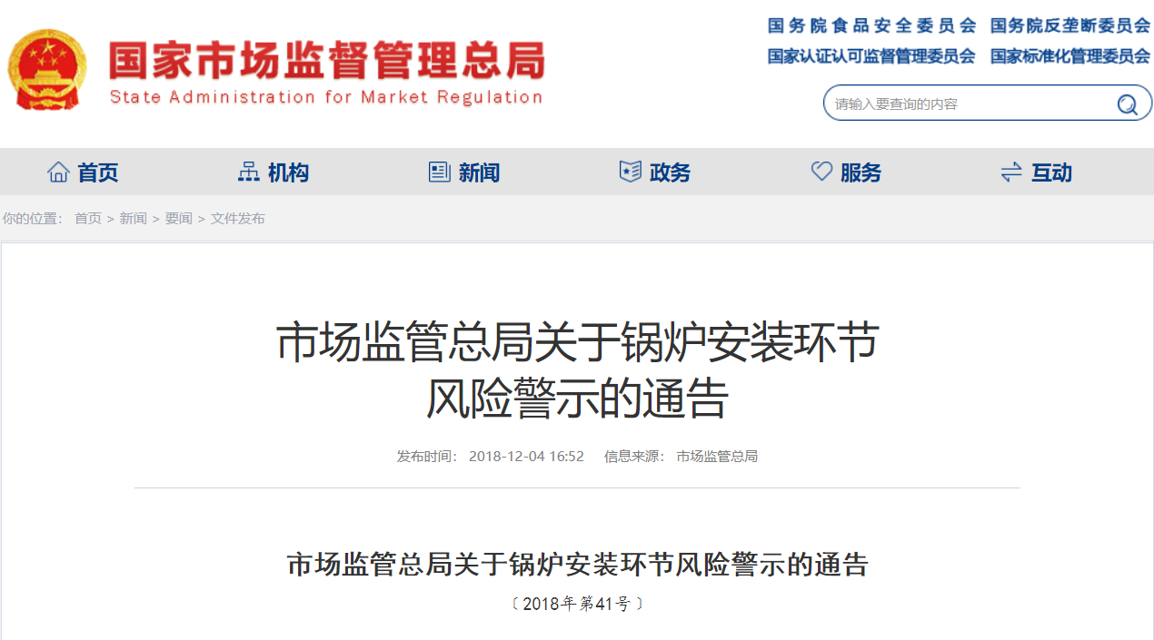 - 市場監(jiān)管總局 關于鍋爐安裝環(huán)節(jié)風險警示的通告