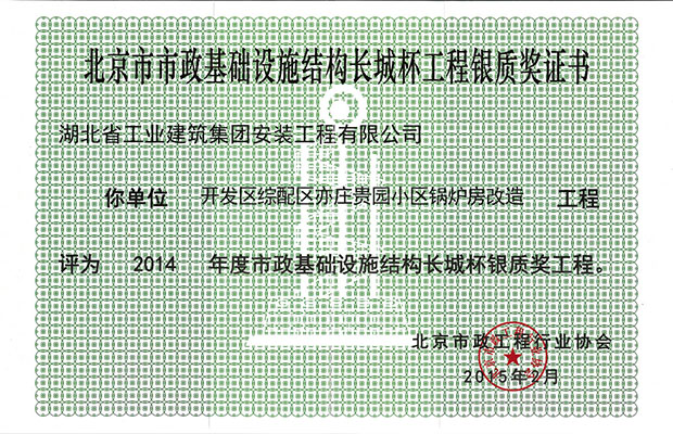 公司2014年度在北京市開(kāi)發(fā)區(qū)綜配區(qū)亦莊貴園小區(qū)的鍋爐房改造工程,于2015年2月被北京市政工程行業(yè)協(xié)會(huì)授予北京市市政基礎(chǔ)設(shè)施竣工長(zhǎng)城杯工程銀質(zhì)獎(jiǎng)。
